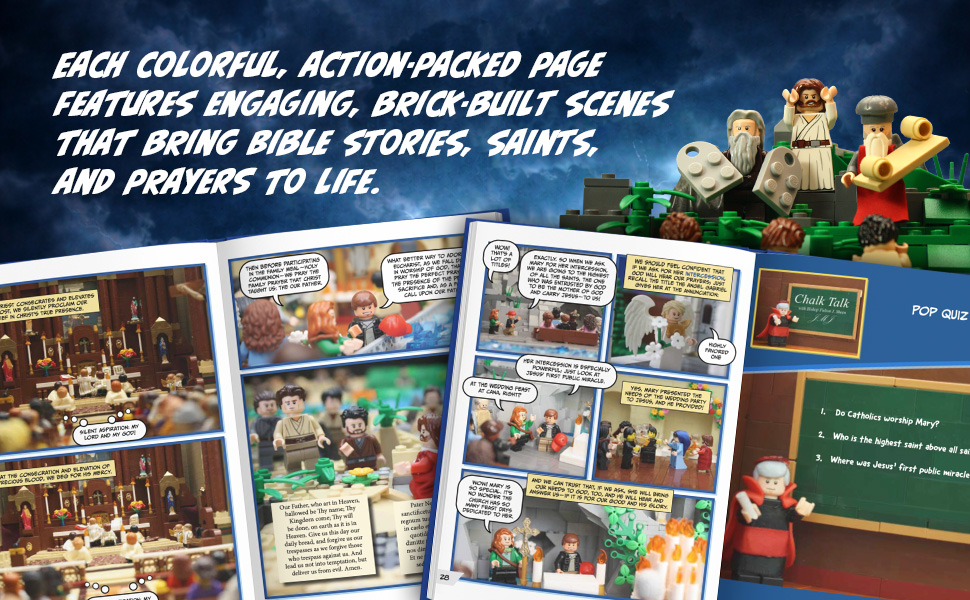 Each colorful, action-packed page features engaging, brick-built scenes that bring Bible stories, saints, and prayers to life. Kids are captivated by the vibrant photos and comic-style storytelling, while parents delight in watching the Faith come alive in their children’s hearts through this fresh, imaginative format.